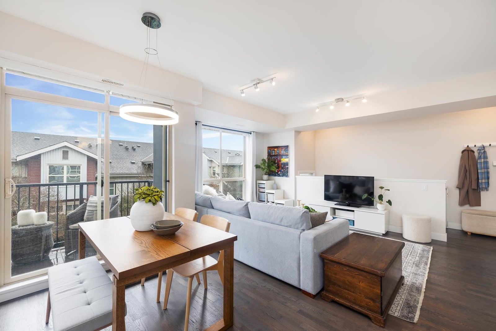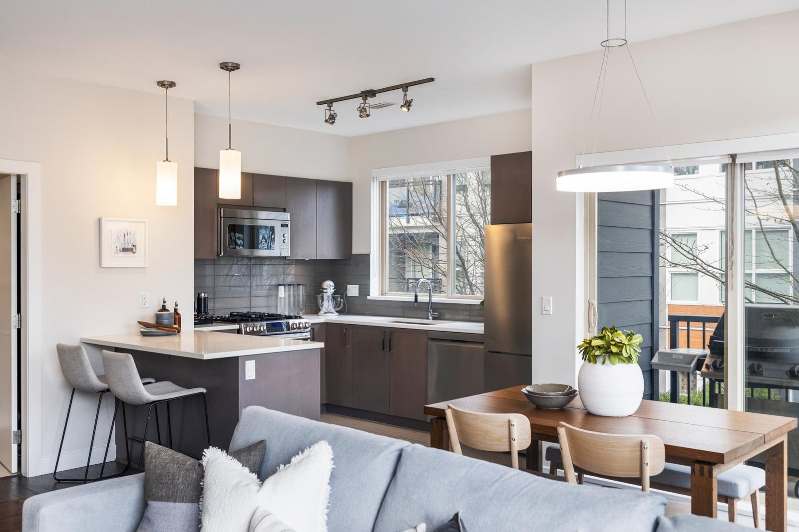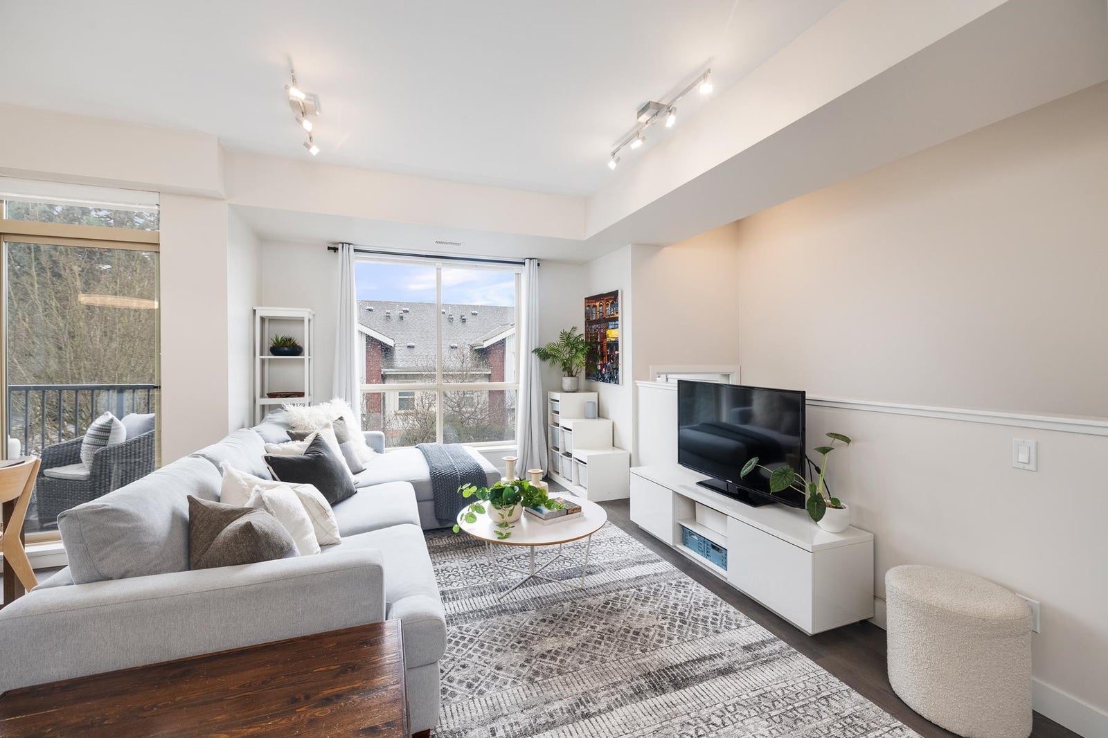 The one you've been waiting for! This premium upper-corner southeast-exposed 3BR/2.5bath 1248sf townhouse at Parc Riviera is flooded w/natural light & offers perhaps the best vantage point in this riverfront development. Quietly tucked away from street traffic, this modern & immac.-maintained 2-lvl home provides a peaceful outlook over beautiful treelined walking paths. Well-appointed design throughout, the main lvl feat's a generous entertaining space, lrg gourmet kitch w/quartz counters & picture window above the sink, powder rm, plus a sunny wraparound covered balc. 3BRs/2Baths up w/soaring vaulted ceils & a juliet balc. Geothermal heating/cooling, 2 pkg stalls, & resort-style amenties (incl. indoor pool, hot tub, sauna & fitness centre). OPEN SAT Mar.14, 3-5pm & SUN Mar.15, 12-2pm.
