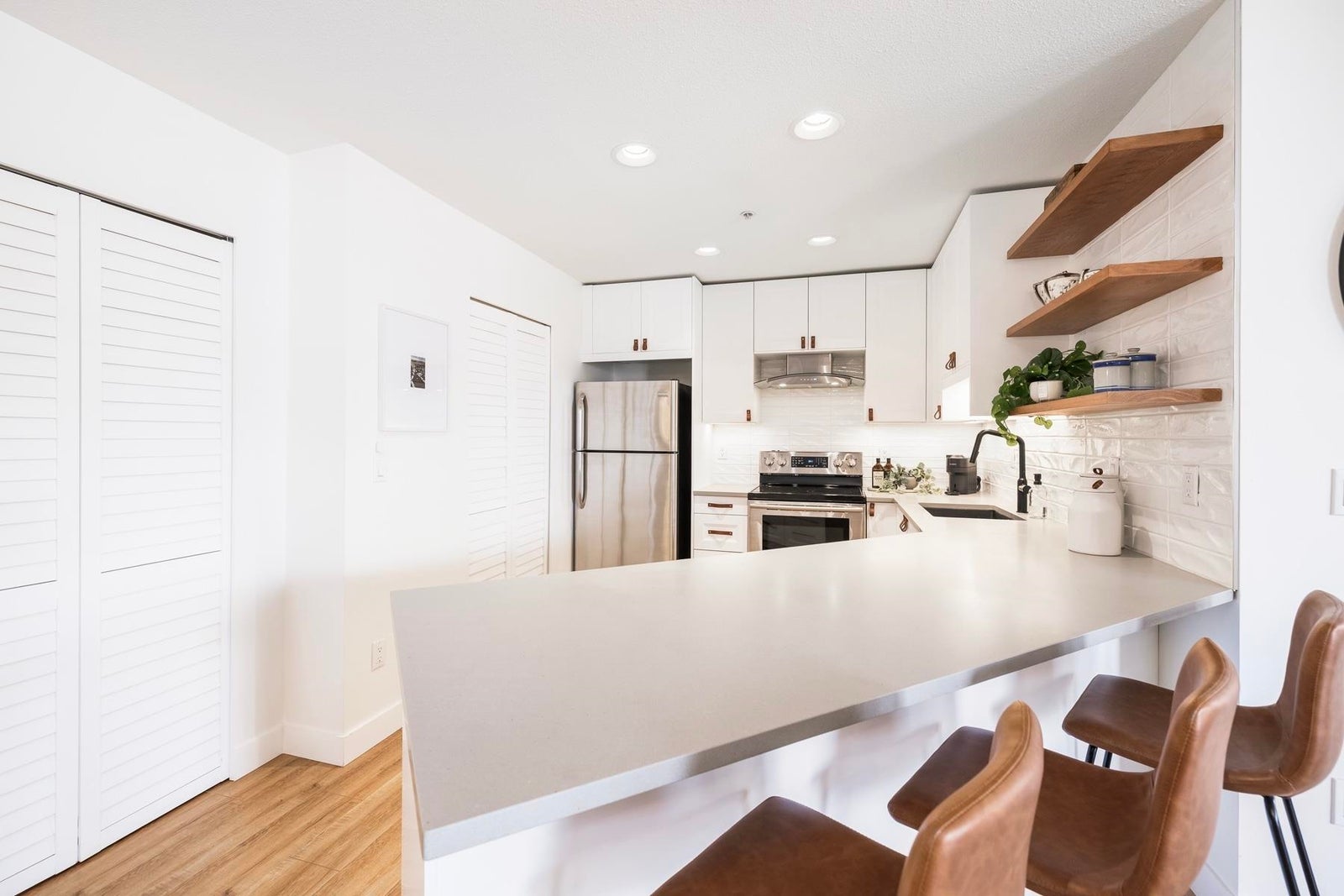 Your heart will skip a beat when you step inside this spacious & beautifully-reno'd 2BR/2Bath penthouse condo at "The Pillars", one of Tsawwassen's most sought-after complexes. Perched amongst the trees & peacefully tucked away at the quiet end of the complex, this bright open-concept corner home welcomes you immediately w/its brilliant floorplan & cute balc overlooking a row of adorable character townhomes. The quality reno & smart design details are apparent. Stunning new kitch w/Caesarstone counters, black undermount siligranit sink, leather cab pulls & floating wood shelves. Updated baths, floors, & black/brushed gold hardware & lighting touches throughout. Cozy gas f/p, radiant h/w heat, BBQ gas hookup & 1 secured pkg. Low maint fees incl. heat, h/w & gas. OPEN SUN APR 13th, 3-5pm.